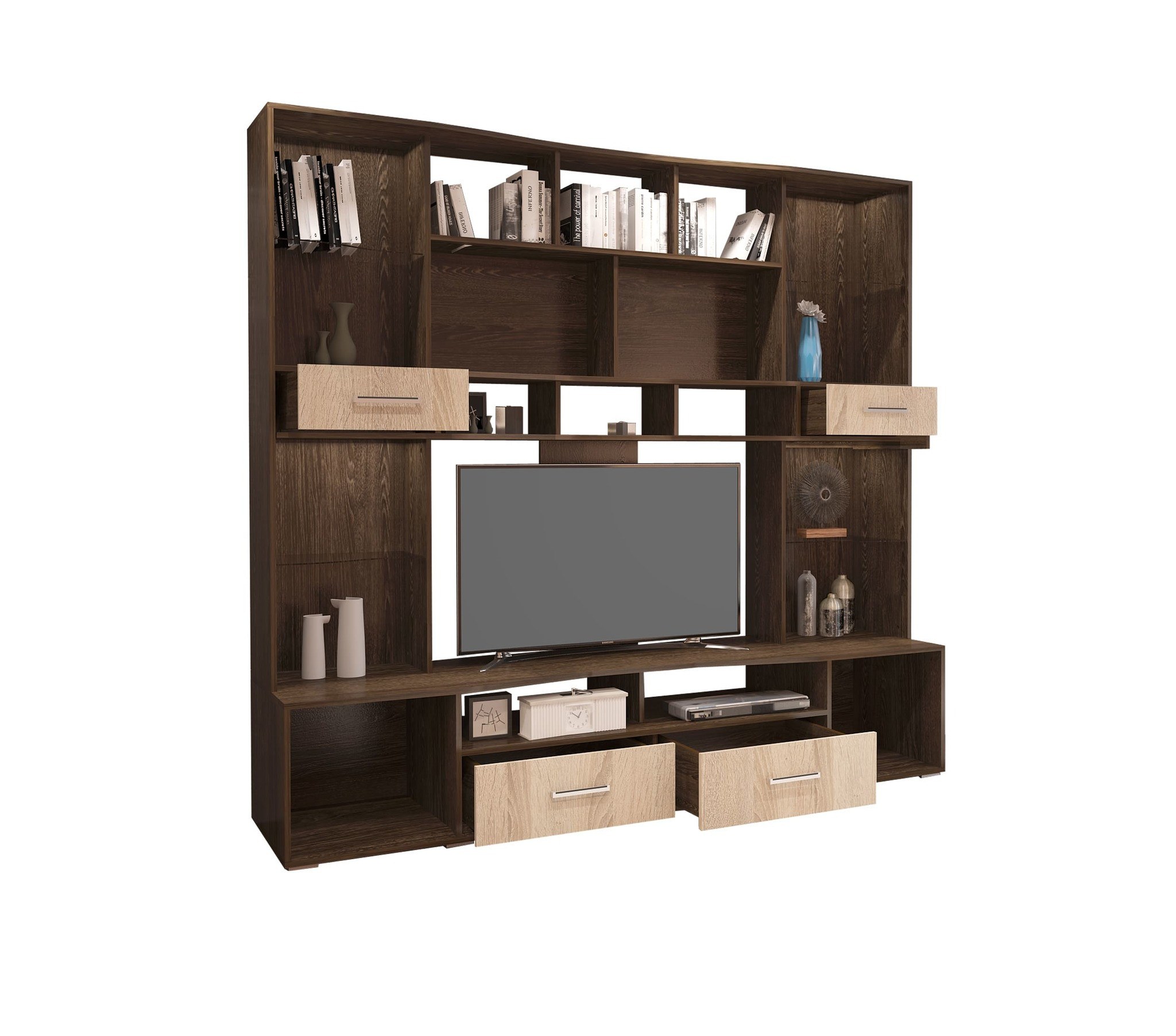 остиная Орхидея выполнена на контрастном сочетании темного Кантерберри и благородного Сонома. Состоит из системы открытых и закрытых полок и ящиков, с гнутыми тонированными стеклостворками. Также, в дополнение к гостиной можно приобрести вместительный шкаф со штангой и пенал шириной 450 мм, что добавляет еще большей функциональности, благодаря большому количеству систем хранения.Размеры стенки: 2150 х 2054 х 542 мм; размер ниши под ТВ: 1204 х 694 мм.